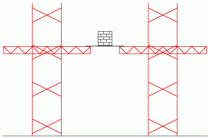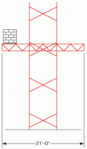 We’ve been asked quite a lot lately why we don’t make a 21-foot bridge unit that can be bolted to a single 7-foot-wide tower like you see in the diagram. That way the end user could erect these “mini-mast climbers” every 21 feet down the wall and connect them with planks. Sounds like a nifty idea – fewer towers to buy and fewer picks to move it. We studied the idea at length and concluded it did not meet our zero-collapse safety standard.