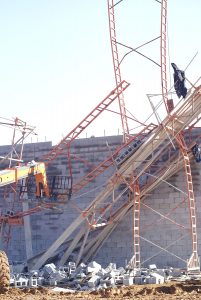 Now let’s look at a 21-foot bridge bolted to a single tower and worked like a “mini mast-climber.” This is where the problems begin.