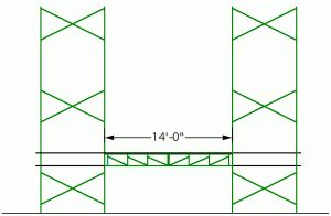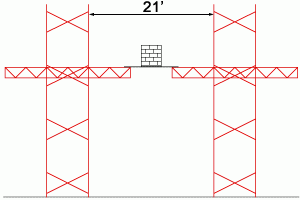 We’ve been asked quite a lot lately why we don’t make a 21-foot bridge unit that can be bolted to a single 7-foot-wide tower like you see in the diagram. That way the end user could erect these “mini-mast climbers” every 21 feet down the wall and connect them with planks. Sounds like a nifty idea – fewer towers to buy and fewer picks to move it. We studied the idea at length and concluded it did not meet our zero-collapse safety standard.