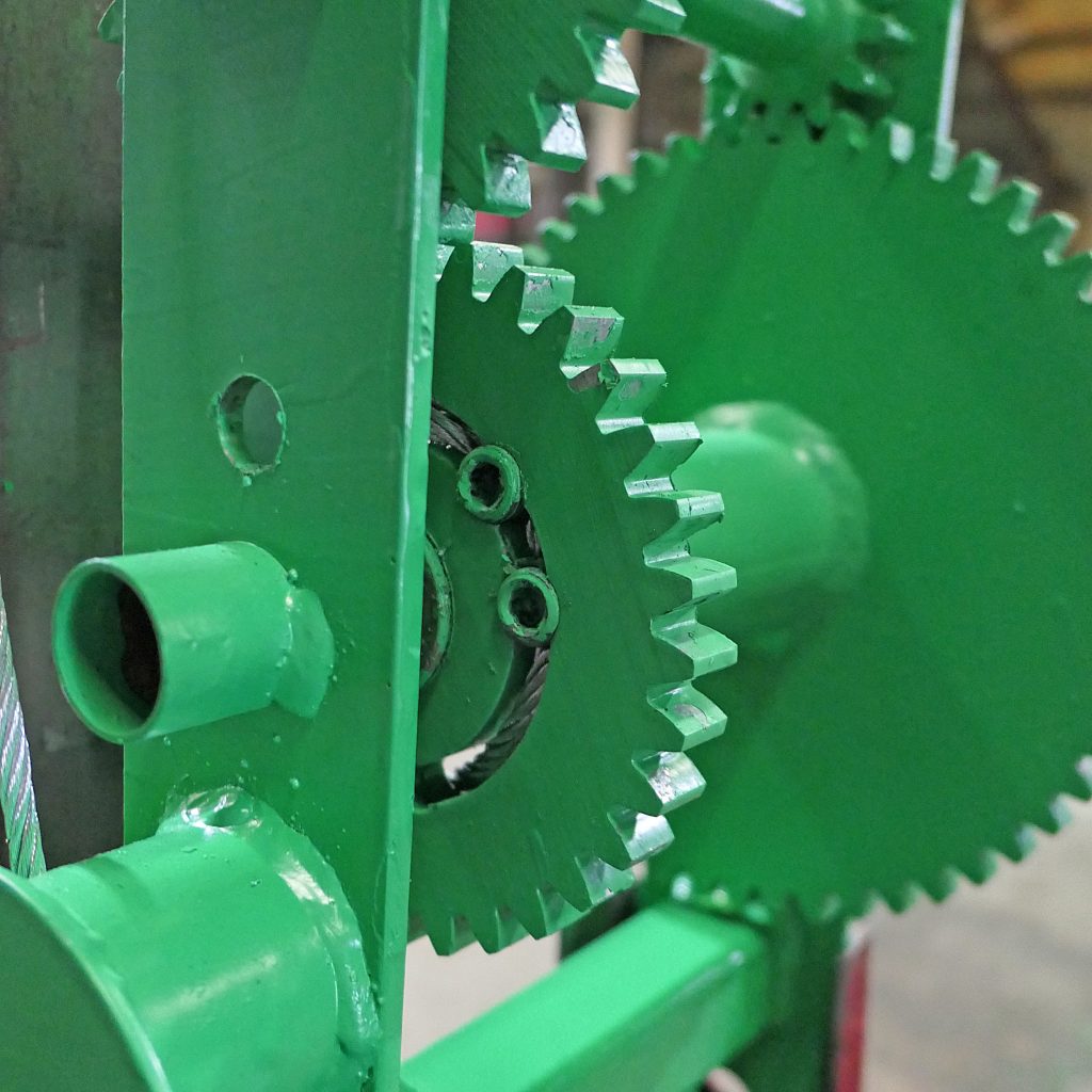 This anti-reverse safety feature means you must intentionally ride the dog with your free hand to reverse the winch. The scaffold can’t accidentally start lowering and dump the boards as has happened on other systems in the past.