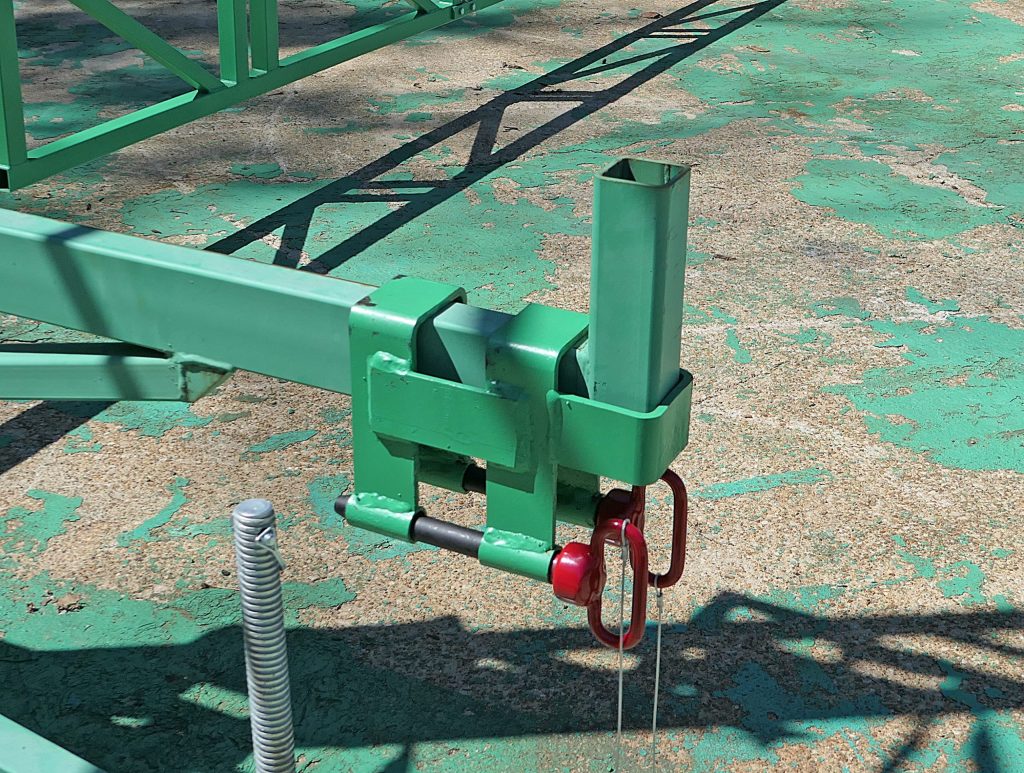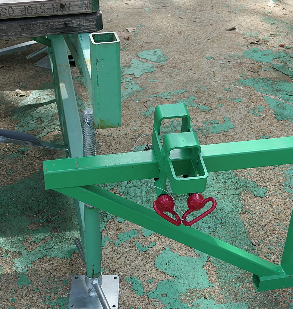 Lock both platform brackets onto the labor-side truss. Then, raise the truss up and secure it to the truss hangers. Use only the locking pins provided by Non-Stop, or equivalent. 2 men can do the job easily without a forklift, but having one is easier.