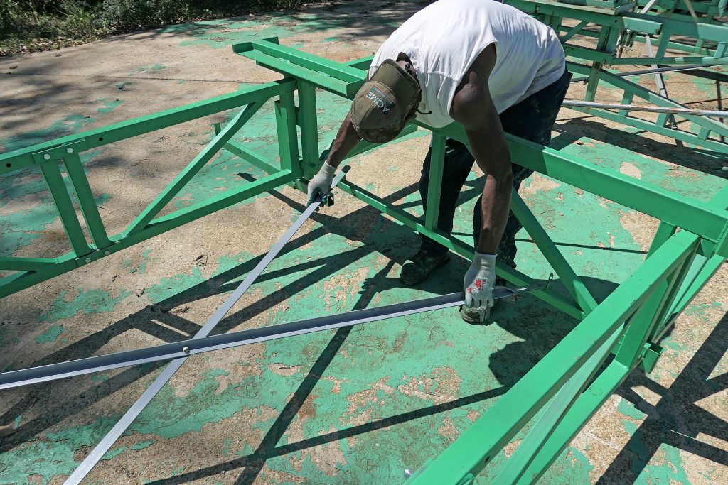 Install 2 straight braces between the trusses, one on each side of the middle bay.