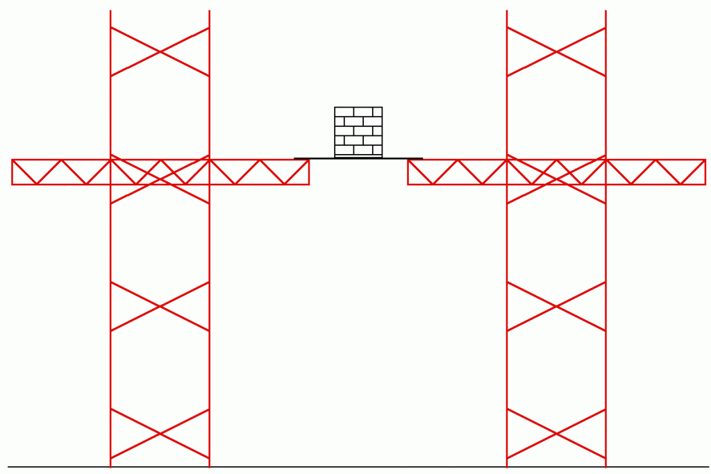 You see, a bridge must be supported on each end, otherwise your load is cantilevered. Cantilevering a pallet of block or brick is likely to cause the tower to tip over, or buckle and fail, like you see below right.