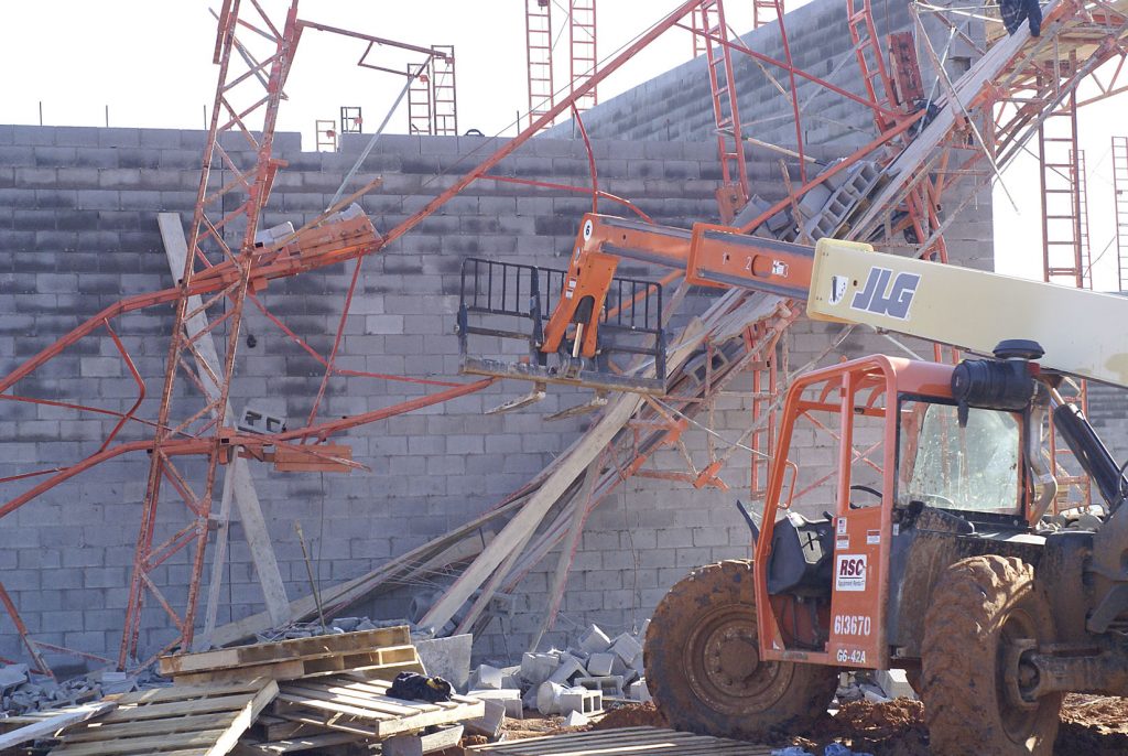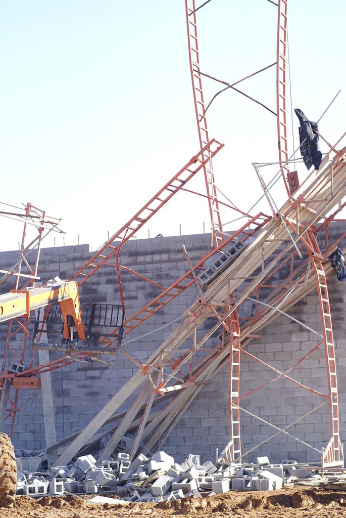 A pallet of materials landed on the planks between the towers will likely cause BOTH of them to collapse. That’s 49 to 63 feet of scaffolding (and workers) going down all at once.