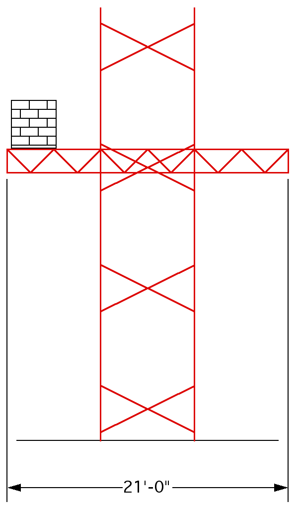 Another company makes a 21-foot bridge unit that can be bolted to a single 7-foot-wide tower like you see in the diagram below left. Using these bridges, the end user could erect “mini-mast climbers” every 21 feet down the wall and connect them together with planks. Sounds like a nifty idea – fewer towers to buy and fewer picks to move it. The main problem is that they collapse!