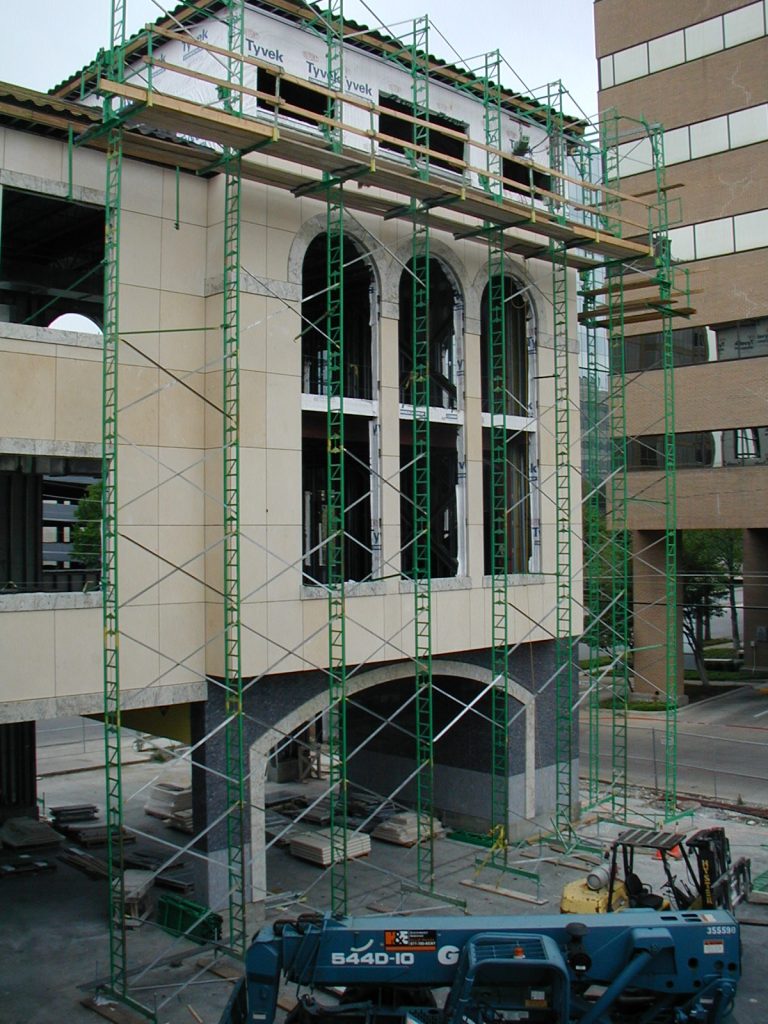 The winches are ideally located so the laborers keep the masons waist-high all day.Standard Duty in the 3-Board configuration. Pull out the Laborers’ outrigger and there’s room for a fourth board.Use a piece of pipe slid over one fork, or the side stabbing forklift bar to move towers. Notice the parts basket with guardrails setup as a man basketWhile Standard-Duty is ideal in a residential setting, it’s equally at home on commercial jobs like this apartment complex. In fact, it’s rated for jobs up to 80 feet high.The laborers platform on Std-Duty holds three or four 16’s and a fourth cut board in open bays. Look at how the saw is tucked away under the workbench (by the bricklayer wearing the white shirt).Although we suggest 30 feet as the maximum height for Standard Duty you can take it much higher (well over 100 feet) when you land that occasional commercial jobThis residential contractor used his Standard-Duty when he landed a nice commercial jobStandard-Duty moved by stabbing from the side63 running feet of Standard-Duty stacked on a trailer. Very compact. Standard duty with an inside corner return to get a couple of extra feet.