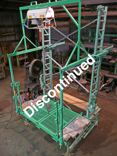 Betamax makes a hoist and trolley system that fastens to our standard overhead protection/winter covering, but it cantilevers the load off the end of the tower, which limits the lifting capacity.