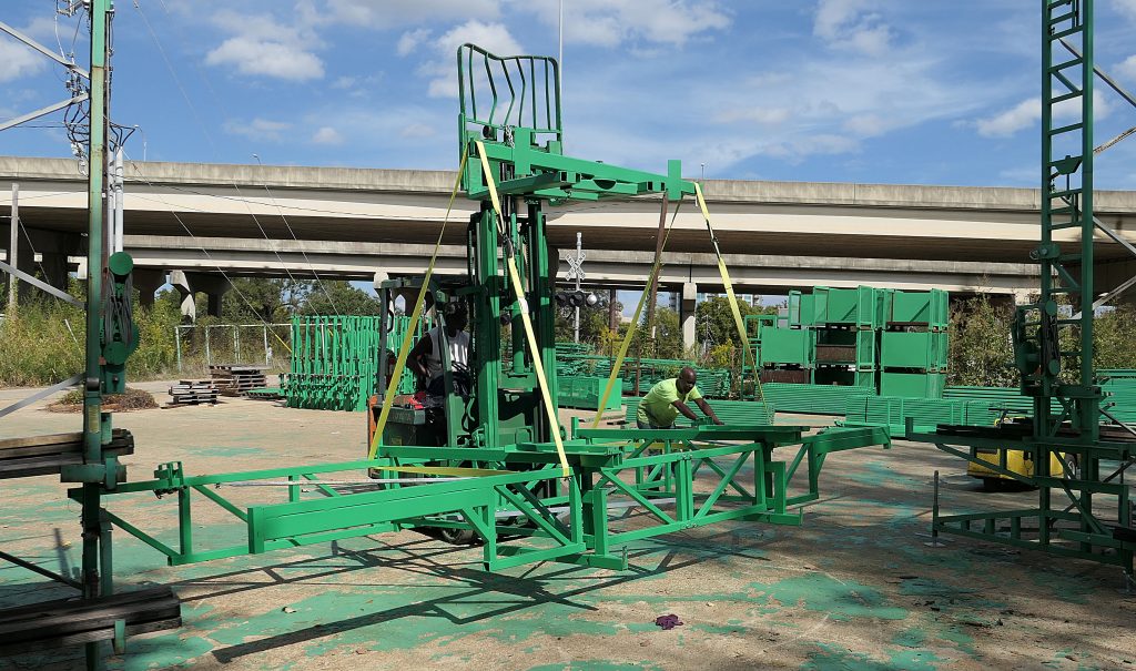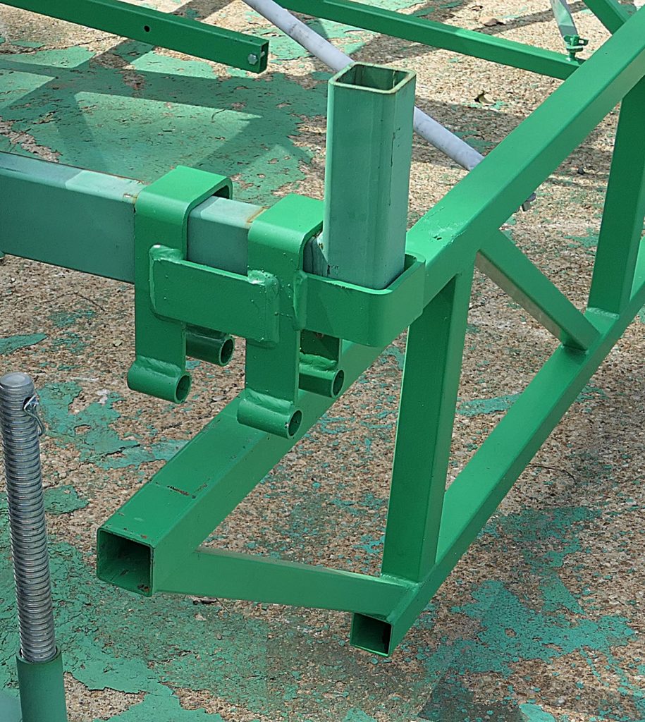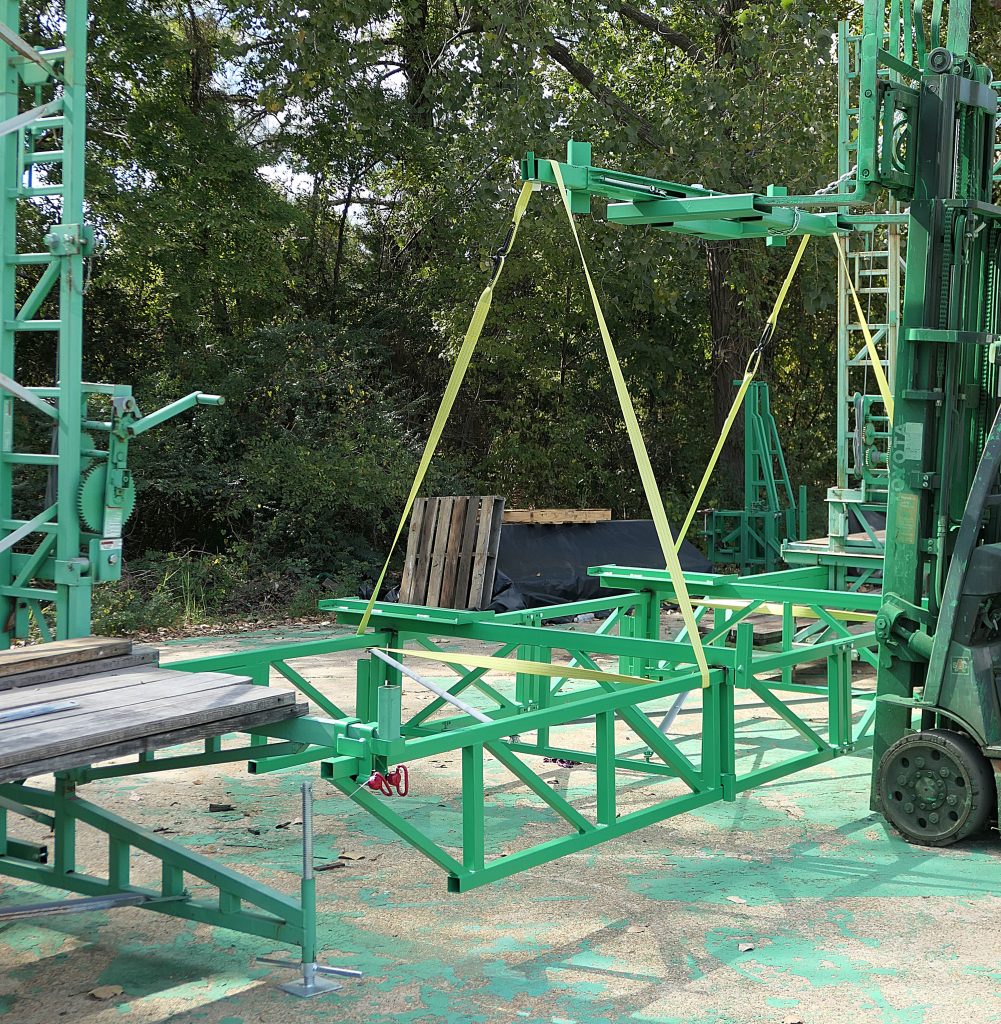 Lock both platform brackets onto the labor-side truss. Then, raise the truss up and secure it to the truss hangers. Use only the locking pins provided by Non-Stop, or equivalent. 2 men can do the job easily without a forklift, but having one is easier.