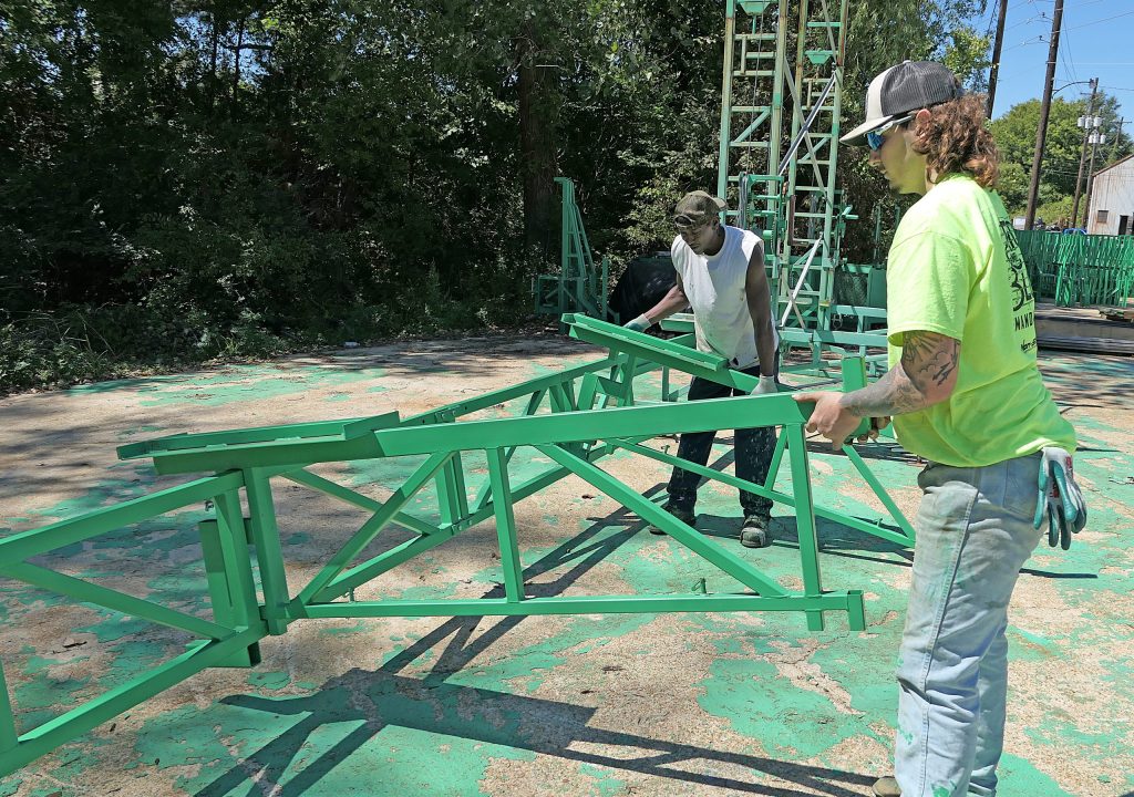 Install 2 straight braces between the trusses, one on each side of the middle bay.